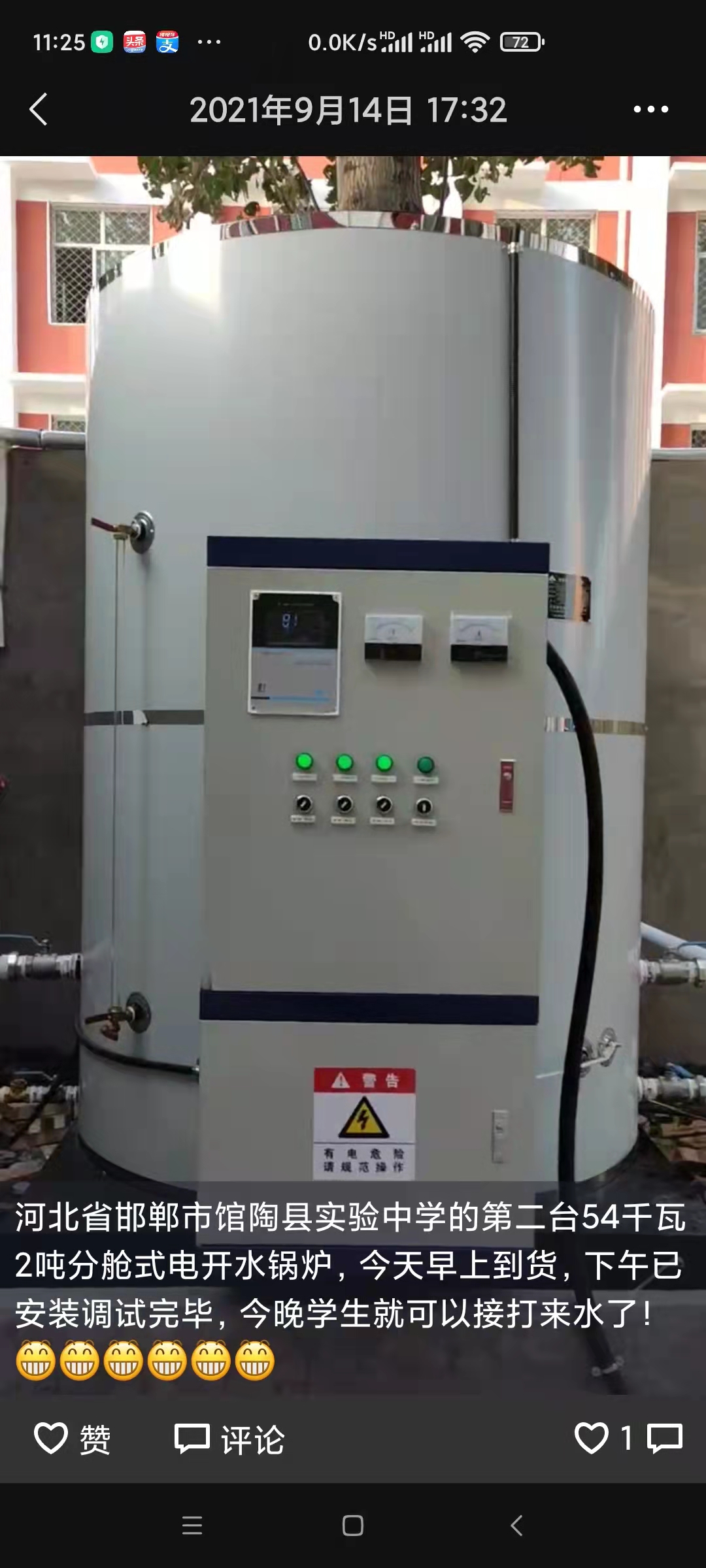 館陶縣實驗中學就是原來的館陶縣第二中學,位于邯鄲市館陶縣文衛街089號,2021年8月份訂購兩臺54千瓦兩噸電開水爐,分別于2021年8月29日和9月14日安裝調試完畢,交付校方使用!